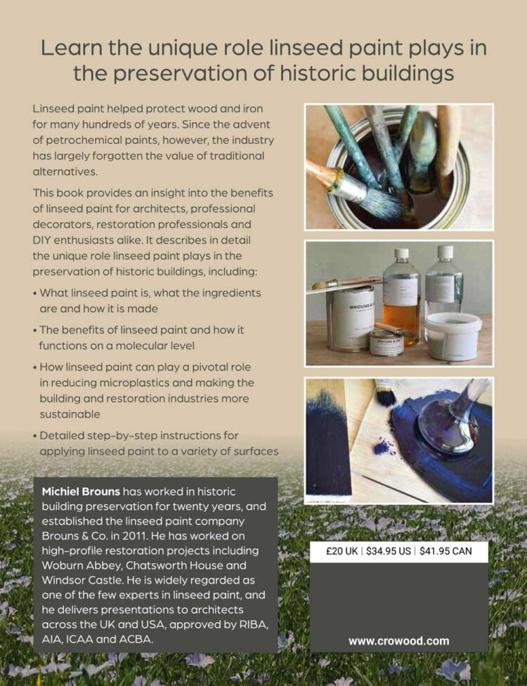 Written by Brouns & Co founder and CEO, Michiel Brouns, it describes the unique part linseed paint plays in the preservation of historic buildings. It provides detailed step-by-step instructions for the application of linseed paint to a variety of substrates. It is a useful and information reference , for architects, profession painters , restoration professionals and even DIY enthusiasts.